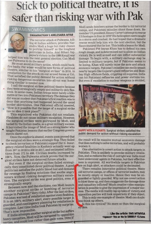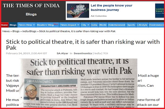 इसका आलेख का मुख्य शीर्षक है, राजनैतिक थिएटर पर ही जमे रहिए, पाकिस्तान से युद्ध के जोखिम के मुकाबले यह सुरक्षित है।