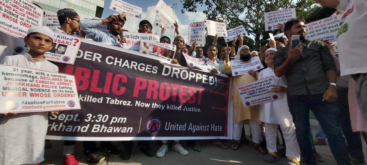 झारखंड के सरायकेला खरसावां में तबरेज़ अंसारी की भीड़ द्वारा की गई लिंचिंग के आरोपियों के विरुद्ध हत्या की धारा 302 को हटा कर गैर इरादतन हत्या 304 लगा कर आरोपियों को बचाने की कोशिश की जा रही है। पुलिस के इस रवैये और न्याय की हत्या के विरुद्ध यूनाइटेड अगेंस्ट हेट ने 13 सितम्बर को दिल्ली स्थित झारखंड भवन का घेराव किया और न्याय व संवैधानिक मूल्य को बचाने के लिए एकजुटता का आह्वान किया।