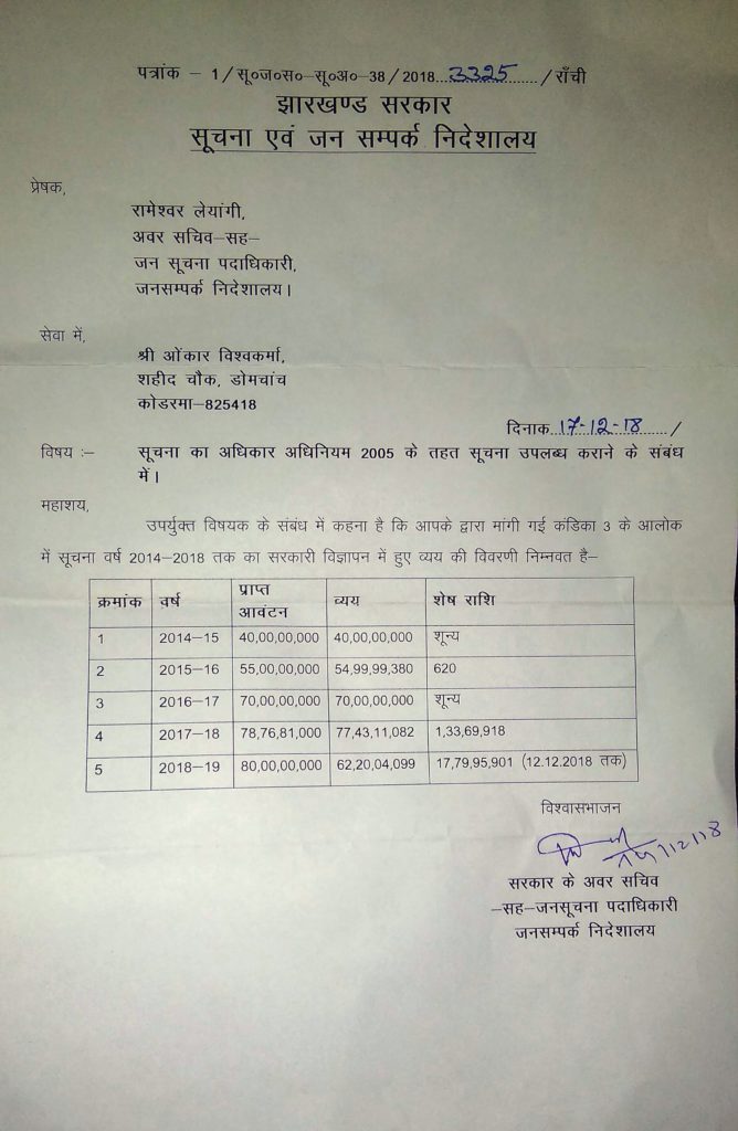 विश्वकर्मा द्वारा लगाई गई आरटीआइ में पूछा गया था कि झारखण्ड सरकार ने अब तक विज्ञापनों के मद में कितना खर्च किया है। बीते 17 दिसंबर को मिले जवाब में बताया गया है कि 2014-15 में सरकार ने विज्ञापनों के मद में 40 करोड़ रुपये का आवंटन किया था जो पूरा खर्च हो गया। अगल वित्त वर्ष्श इस आवंटन को 15 करोड़ बढ़ा दिया गया। इसके बाद फिर से अगले वित्त वर्ष में राशि को 15 करोड़ बढ़ाते हुए 70 करोड़ पर ला दिया गया।