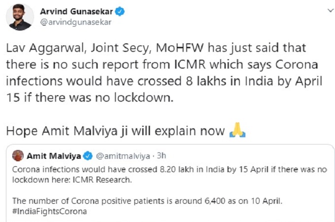 बीजेपी आईटी सेल के हेड अमित मालवीय ने एक ट्वीट में बताया कि आईसीएमआर (इंडियन काउंसिल आफ मेडिकल रिसर्च) की एक रिसर्च में दावा किया गया है कि अगर 15 अप्रैल को लाक डाउन न किया गया होता तो मरीजों की संख्या 8 लाख बीस हज़ार से ज्यादा हो जाती। ज़ाहिर है, आईटी सेल की ओर 24 घंटे मुंह बाये देखने वाले मीडिया ने इस कथित रिसर्च को लपक लिया और चारो ओर मोदी जी की बुद्धिमत्ता के झंडे गाड़े जाने लगे।