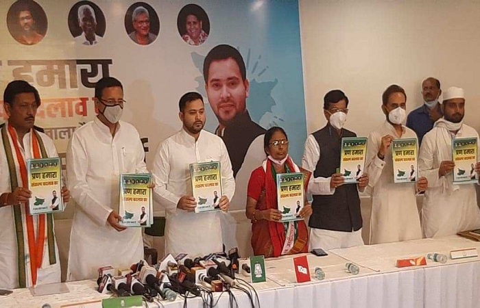 बिहार विधानसभा चुनाव के लिए महागठबंधन में शामिल दलों ने शनिवार को संकल्प पत्र जारी किया। ‘प्रण हमारा संकल्प बदलाव का’ टैग लाइन के साथ जारी किये गए इस संकल्प पत्र में युवाओं को 10 लाख रोजगार, नियोजित शिक्षकों को समान काम-समान वेतन, शिक्षा मित्रों को स्थायी करने, शिक्षा पर कुल बजट का 12 फीसदी हिस्सा खर्च करने, आशा कर्मियों और जीविका दीदियों का मानदेय दोगुना करने व नियमित वेतन देने, प्रवासी मजदूरों के लिए कर्पूरी श्रम केंद्र खोलने, किसानों की कर्ज माफी, बंद चीनी मिलों को फिर से खोलने और विधान सभा के पहले दिन तीनों कृषि बिल के खिलाफ प्रस्ताव पास कराने समेत कई वायदे किये गये हैं।