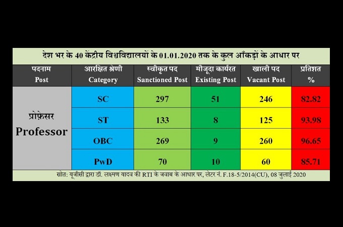 ऊपर का चार्ट बताता है कि आलम क्या है। आज़ादी के सत्तर साल बाद ये केंद्रीय विश्वविद्यालयों के आँकड़े हैं। ये आँकड़े जुटाये हैं दिल्ली विश्वविद्यालय के एक कॉलेज में एड्हाक शिक्षक और सामाजिक-राजनीतिक प्रश्नों पर बेहद जागरूक, डॉ.लक्ष्मण यादव ने। उन्होंने बहुत धैर्य और लगन से आरक्षण के नाम पर हो रहे खेल की तह खोली और 8 जुलाई को उन्हें विश्वविद्यालय अनुदान आयोग से अपनी उस आरटीआई का जवाब मिल गया जिसमें ख़ाली पदों के बारे में जानकारी माँगी गयी थी। यूजीसी ने अपने जवाब में बताया है कि केंद्रीय विश्वविद्यालयों में अनुसूचित जाति के 82.82 फ़ीसदी, अनसूचित जानजाति के 93.98 फ़ीसदी और पिछड़े वर्ग के 96.65 फीसदी पद ख़ाली पड़े हैं।