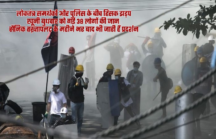 म्यांमार में लोकतंत्र समर्थक प्रदर्शन मातम में बदल गए हैं। लोकतंत्र समर्थकों और पुलिस के बीच हिंसक झड़प में ‘खूनी बुधवार’ को 38 लोगों की जान चली गई है।
