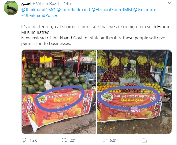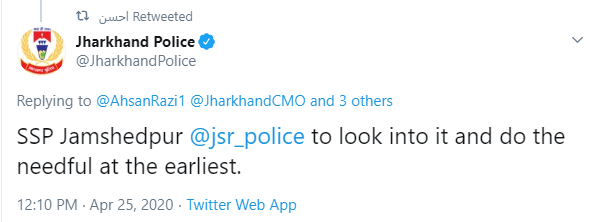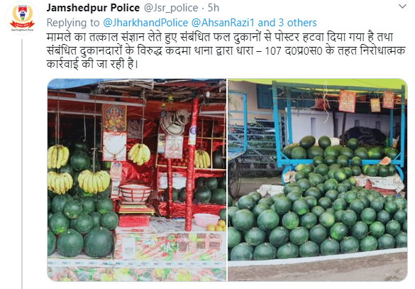 इस ट्वीट में यूज़र ने झारखंड सीएमओ, झारखंड के मुख्यमंत्री हेमंत सोरेन, जमशेदपुर पुलिस, झारखंड पुलिस और झारखंड मुक्ति मोर्चा को टैग किया था। इस ट्वीट पर झारखंड पुलिस ने 25 अप्रैल 2020 को 12 बजकर 10 मिनट (दोपहर) पर एसएसपी जमशेदपुर को टैग करते हुए मामले का संज्ञान लेकर ज़रूरी कार्रवाई करने को कहा। 25 अप्रैल 2020 को ही 2 बजकर 12 मिनट पर जमशेदपुर पुलिस ने झारखंड पुलिस के ट्वीट का जवाब देते हुए एक ट्वीट किया कि “मामले का तत्काल संज्ञान लेते हुए संबंधित फल दुकानों से पोस्टर हटवा दिया गया है तथा संबंधित दुकानदारों के विरुद्ध कदमा थाना द्वारा धारा- 107, दंड प्रक्रिया संहिता के तहत निरोधात्मक कार्रवाई की जा रही है।”