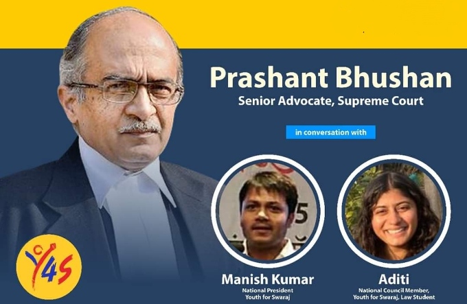 प्रशांत भूषण यूथ फॉर स्वराज के “एक नागरिक के रूप में हमारा सर्वोच्च कर्तव्य: भारत आज अपने युवाओं क्या चाहता है?” विषय पर ऑनलाइन इन्टरव्यू दे रहे थे। चर्चा कै दौरान प्रशांत भूषण ने देश और समाज से लेकर ज्यूडीशियल रिफॉर्म तक तमाम मुद्दों पर बेबाकी से अपनी बात रखी।