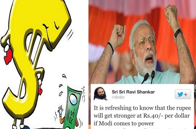 अगर मोदी राज में अर्थव्यवस्था को लेकर किए गए दावों की याद कीजिए तो हालात किसी चुटकुले से कम नहीं है। 2014 के चुनाव के चंद महीने पहले श्री श्री रविशंकर ने कहा था कि मोदी राज में एक डॉलर 40 रुपये का हो जाएगा।