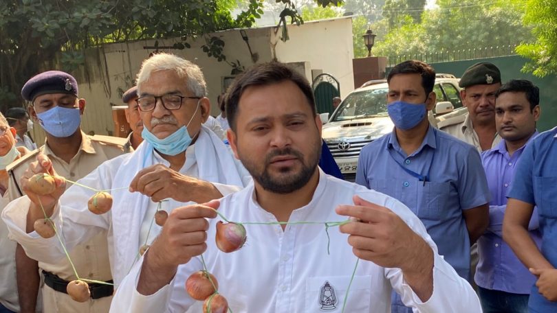 मीडिया से बात करते हुए तेजस्वी यादव हाथ में प्याज़ की माला लिये हुए थे। उन्होंने पूथा कि बिहार के मुख्यमंत्री नीतीश कुमार जी कहाँ हैं, महंगाई पर उनकी चुप्पी क्यों हैं? उनके मुंह में दही क्यों जमा है?