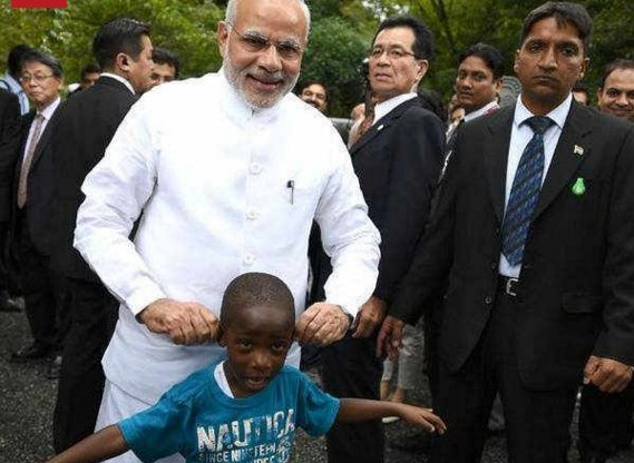 एक और तस्वीर बहुत वायरल हुई थी जिसमें एक अश्वेत अफ्रीकी बच्चे का कान खींचते वे फ्रेम में आ गए थे। सहमे हुए बच्चे और हर्षित मोदी के चेहरे के परस्पर विरोधी भावों का अध्ययन किया जाना चाहिए था।