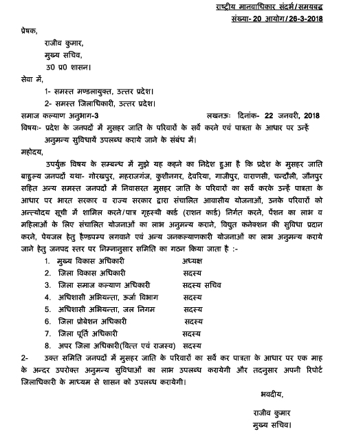 “प्रदेश के मुसहर जाति बाहुल्य जनपदों यथा- गोरखपुर, महराजगंज, कुशीनगर, देवरिया, गाजीपुर, वाराणसी, चंदौली, जौनपुर सहित अन्य समस्त जनपदों में निवासरत मुसहर जाति के परिवारों का सर्वे करके उन्हें पात्रता के आधार पर भारत सरकार व राज्य सरकार द्वारा संचालित आवासीय योजनाओं, उनके परिवारों को अंत्योदय सूची में शामिल करने/पात्र गृहस्थी कार्ड (राशन कार्ड) निर्गत करने, पेंशन का लाभ व महिलाओं के लिए संचालित योजनाओं का लाभ अनुमन्य कराने, विद्युत कनेक्शन की सुविधा प्रदान करने, पेयजल हेतु हैंडपंप लगवाने एवं अन्य जन कल्याणकारी योजनाओं का लाभ अनुमन्य कराये जाने हेतु जनपद स्तर पर मुख्य विकास अधिकारी की अध्यक्षता में समिति का गठन किया जाता है। समाज कल्याण अधिकारी समिति के सदस्य सचिव होंगे जबकि जिला विकास अधिकारी, जिला प्रोबेशन अधिकारी, जिला पूर्ति अधिकारी, अपर जिला अधिकारी (वित्त एवं राजस्व), ऊर्जा विभाग और जल निगम के अधिशासी अभियंता इसके बतौर सदस्य होंगे। उक्त समिति जनपदों में मुसहर जाति के परिवारों को सर्वे कर पात्रता के आधार पर एक माह के अंदर उपरोक्त अनुमन्य सुविधाओं का लाभ उपलब्ध करायेगी और तदनुसार अपनी रिपोर्ट जिलाधिकारी के माध्यम से शासन को उपलब्ध करायेगी।”