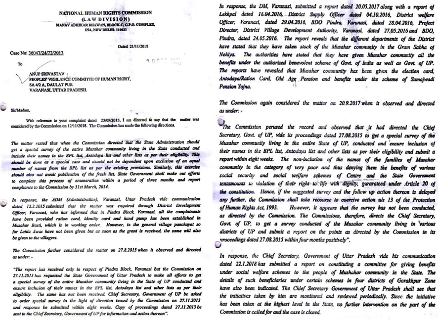 राष्ट्रीय मानवाधिकार आयोग ने 20 सितंबर 2017 को मामले की सुनवाई के दौरान उत्तर प्रदेश शासन के मुख्य सचिव को आदेश दिया कि “अत्यंत गरीब श्रेणी में मुसहर समुदाय के परिवारों का नाम शामिल नहीं किया जाना और केंद्र एवं राज्य सरकार की सामाजिक सुरक्षा एवं जन कल्याणकारी योजनाओं का लाभ उन्हें इस तरह से मुहैया नहीं कराना भारतीय संविधान के अनुच्छेद-20 के तहत सुनिश्चित सम्मान के साथ जीवन जीने के उनके अधिकार का उल्लंघन करने के समान है। इसलिए, यदि प्रस्तावित सर्वे और उसके आधार पर कार्रवाई में आगे देरी की जाती है तो आयोग मानवाधिकार सुरक्षा अधिनियम-1993 की धारा-13 के तहत कठोर कार्रवाई करेगा।”