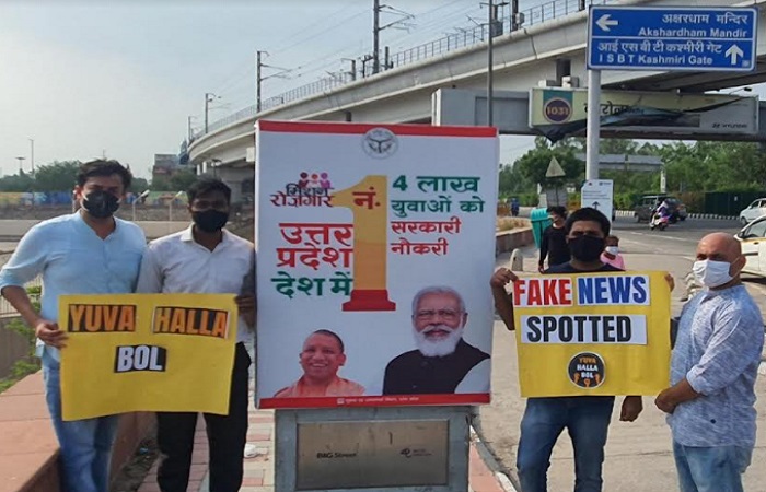 बेरोजगारी को राष्ट्रीय बहस बनाने में जुटे संगठन ‘युवा हल्ला बोल’ ने इस सिलसिले में जारी बयान में कहा है कि सरकारों द्वारा किए जा रहे झूठे वादों और प्रचार को एक्सपोज करने का अभियान शुरू किया है। इसी अभियान के तहत 12 जुलाई को युवा हल्ला बोल की टीम ने दिल्ली में विभिन्न स्थानों पर योगी सरकार द्वारा लगाए गए पोस्टरों पर “Fake News Spotted” वाले बैनर के साथ फोटो खिंचवाकर अपना विरोध जताया और सोशल मीडिया पर शेयर किया जिसके समर्थन में अन्य लोगो ने भी इस तरह के Fake News को एक्सपोज करने वाली फोटो डाली।