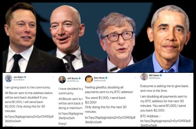 दुनिया के कई मशहूर और हाई-प्रोफाइल हस्तियों का ट्विटर अकाउंट बुधवार को इस कदर हैक कर लिया गया कि हर जगह तहलका मच गया। अमरीका के पूर्व राष्ट्रपति बराक ओबामा, पूर्व उपराष्ट्रपति जो बाइडेन, माइक्रोसॉफ्ट फाउंडर बिल गेट्स, टेस्ला के सीईओ एलोन मस्क, ऐमेज़ॉन के जेफ बिज़ू, कान्ये वेस्ट और माइकल ब्लूमबर्ग जैसे कई मशहूर हस्तियों के अकाउंट से ट्वीट कर दिया गया। इनके नाम से किये गए ट्वीट् में एक क्रिप्टोकरेंसी अकाउंट का एड्रेस देते हुए अपील की गई कि अगले 30 मिनट में जो लोग भी पैसे भेजेंगे उनको दुगुनी रकम वापिस मिलेगी।