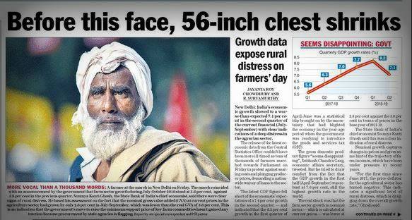अंग्रेजी अखबारों में इंडियन एक्सप्रेस ने शीर्षक में वही लिखा है जो किसान या किसान नेता चाहते हैं। फ्लैग शीर्षक है, खेती का संकट दिल्ली पहुंचा। मुख्य शीर्षक है, किसानों के विरोध में विपक्ष ने प्रधानमंत्री को निशाना बनाया। कर्ज माफी रोजगार पर जवाब मांगे। द टेलीग्राफ का शीर्षक सबसे अलग और अनूठा है। एक अकेले किसान की तीन कॉलम की फोटो और सात कॉलम का शीर्षक, इस चेहरे के आगे 56 ईंची सीना सिकुड़ जाता है। मुख्य खबर का शीर्षक है, किसान दिवस (फार्मर्स डे) पर विकास के आंकड़ों से ग्रामीण परेशानी की पोल खुली। टाइम्स ऑफ इंडिया ने दिल्ली में तो पहले पेज पर किसानों की खबर रखी है पर मुंबई में इसकी जगह कोयला सचिव को सजा वाली खबर है। इससे आप अखबारों, खबरों की प्राथमिकता पर अटकल लगा सकते हैं।