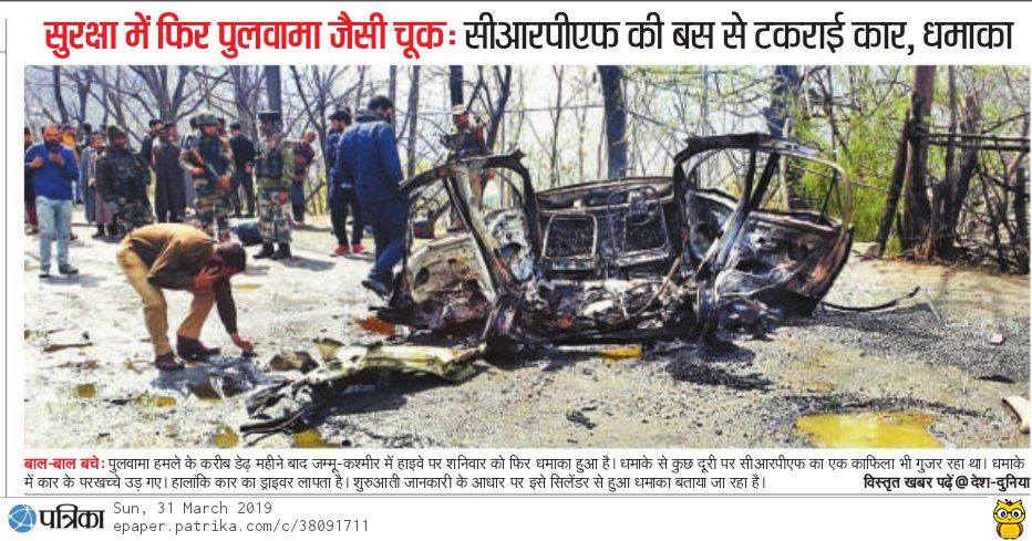 अमर उजाला में भी यह खबर लीड है। शीर्षक है, सीआरपीएफ काफिले के पास पिर धमाका, कार ने मारी टक्कर। उपशीर्षक है, पुलवामा जैसे हमले की आशंका बस को मामूली नुकसान कोई जवान घायल नहीं। अमर उजाला ब्यूरो की इस खबर का एक अंश इस प्रकार है, “… कार में एक बड़ा सिलेंडर भी रखा हुआ था अगर दूसरा सिलेंडर भी फट जाता तो स्थिति भयावह हो सकती थी। घटना शनिवार सुबह 10.30 बजे हुई। जवाहर टनेल के पास जम्मू आ रहे सीआरपीएफ काफिले में शामिल बस के पीछे से आ रही सफेदसैन्ड्रो कार टकरा गई। जवान कुछ समझ पाते इसके पहले धमाके के साथ कार में आग लग गई। घटना के बाद पांच घंटे तक काजीकुंड से लेकर रामबन तक हाईवे को खंगालने के बाद सीआरपीएफ के काफीले को आग बढ़ने की मंजूरी दी गई।”