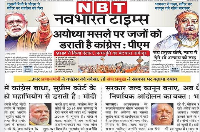 दैनिक हिन्दुस्तान ने प्रधानंमत्री के आरोप की खबर पहले पेज पर टॉप में दो कॉलम में लगाया है। शीर्षक में या आस-पास कपिल सिबल या कांग्रेस का पक्ष नहीं है। नवभारत टाइम्स में पहले पेज पर पूरा विज्ञापन है। ईयर पैनल में सूचना है, “रैली में पीएम ने मंदिर पर कांग्रेस को घेरा”। खबरों के पहले पन्ने पर यह खबर धर्म सभा की खबर के साथ बैनर से ज्यादा प्रमुखता है। मास्टहेड पर चढ़ी हुई है। फोटो देखें। नवोदय टाइम्स में यह खबर धर्म सभा की खबर से अलग पहले पेज पर दो कॉलम में है। प्रधानमंत्री की डेढ़ कॉलम की फोटो के साथ जिसमें वे दोनों हाथ फैलाए हुए हैं। दैनिक जागरण में अयोध्या पर सुप्रीम कोर्ट के जजों को डरा रही है कांग्रेस शीर्षक से यह खबर धर्म सभा की मुख्य खबर के नीचे चार कॉलम में है। अमर उजाला ने प्रधानमंत्री के आरोप के जवाब में मोहन भागवत के बयान को लगाया है। पहले पेज पर धर्म सभा की खबर के नीचे। राजस्थान पत्रिका ने धर्म सभा की खबर के साथ प्रघानमंत्री के आरोप को पहले पेज पर ही सिंगल कॉलम में छापा है।