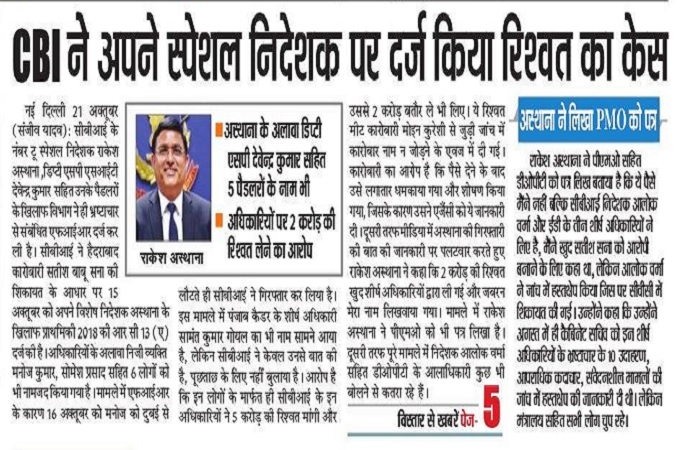 अखबार ने खबर के बीच में अस्थाना की फोटो के साथ एक बॉक्स बनाया है जिसमें लिखा है, अस्थाना के अलावा डिप्टी एसपी देवेन्द्र कुमार सहित पांच पेडलरों के नाम भी हैं । दूसरा बिन्दु है, अधिकारियों पर दो करोड़ की रिश्वत लेने का आरोप। नवभारत टाइम्स में एफआईआर और संबंधित विवाद की खबर पहले पेज पर नहीं है। फास्ट न्यूज शीर्षक से छोटी-छोटी खबरों के समूह में एक खबर है, सीबीआई में अफसरों के बीच विवाद से पीएमओ नाराज। खबर इस प्रकार है, सीबीआई ने अपने नंबर 2 अफसर राकेश अस्थाना पर रिश्वत घोटाले में मामला दर्ज किया है। इस पूरे प्रकरण में पीएमओके नाराज होने की जानकारी सामने आई है। इस खबर का विस्तार अंदर के पेज पर है और वहां भी खबर इसी लाइन पर है। दैनिक जागरण ने इस खबर को लीड बनाया है। शीर्षक है, सीबीआई ने अपने विशेष निदेशक पर किया घूसखोरी का मुकदमा।