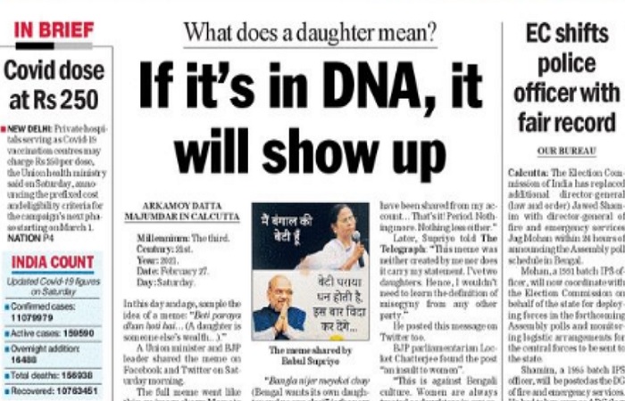द टेलीग्राफ में आज भी पहले पन्ने पर आधा विज्ञापन है फिर भी पहले पन्ने की पांच खबरों में सिर्फ एक ऐसी खबर है जो बाकी चार में पहले पन्ने पर है और वह है, 250 में टीका लगेगा। आज अखबार की लीड है, “अगर डीएनए में होगा, तो दिख जाएगा।” फ्लैग शीर्षक है, “बेटी होने का क्या मतलब है?” इसके साथ अखबार ने बताया है कि आज के समय में भी एक केंद्रीय मंत्री और भाजपा नेता ने एक मीम फेसबुक और ट्वीटर पर शेयर किया है जो इस मुख्य विचार पर आधारित है कि बेटी पराया धन होती है। इसके साथ उस मीम की तस्वीर भी है। तस्वीर में अमित शाह की तस्वीर के साथ कहा गया है, बेटी पराया धन होती है। इस बार विदा कर देंगे। ऊपर ममता बनर्जी की फोटो के साथ लिखा है, मैं बंगाल की बेटी हूं।