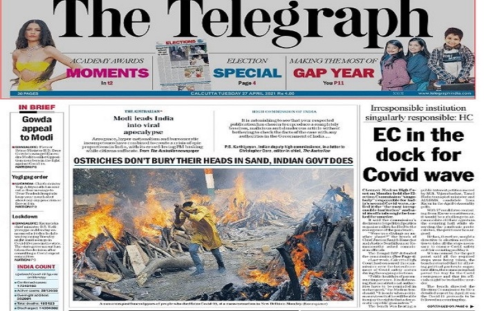 द टेलीग्राफ ने बताया है कि दि ऑस्ट्रेलियन ने क्या लिखा और भारतीय डिप्टी हाईकमिश्नर ने अखबार के संपादक को क्या लिखा। इसके अनुसार मोदी ने भारत को वायरल कयामत में पहुंचा दिया। अहंकार, अति राष्ट्रवाद और नौकरशाही की अक्षमता ने मिलकर भारत के लिए शीर्ष स्तर का संकट तैयार किया और भीड़ पसंद करने वाले प्रधानमंत्री उसका आनंद ले रहे हैं जबकि नागरिक घुट रहे हैं। इसपर भारत की ओर से दि ऑस्ट्रेलियन को लिखा गया है, आपके सम्मानित प्रकाशन ने पूरी तरह निराधार, संदिग्ध और अपमानजनक आलेख प्रकाशित किया है और भारत सरकार में किसी अधिकारी से तथ्यों की जांच करने की परवाह भी नहीं की ….. । यह खबर देते हुए अखबार ने लिखा है, शुतुर्मुर्ग अपना सिर रेत में नहीं छिपाते हैं, भारत सरकार ऐसा करती है। कहने की जरूरत नहीं है जि प्रधानमंत्री की योग्यता, क्षमता, कौशल का डंका दुनिया में बज रहा है उसकी चर्चा किए बगैर इंडियन एक्सप्रेस ने भारत में क्या हो रहा है सिर्फ उसे छापा है। बात सही-गलत होने की नहीं, प्रचारक की भूमिका स्वीकार कर लेने की है।