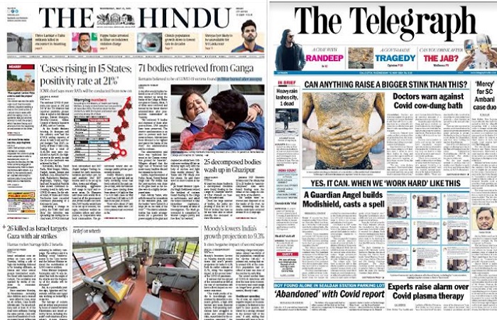 आज भी द टेलीग्राफ में पहले पन्ने की लगभग सारी खबरें ऐसी हैं जो दिल्ली के चार अखबारों में पहले पन्ने पर नहीं हैं। अखबार ने दो खबरें खास शैली में छापी हैं। पहली खबर के शीर्षक के ऊपर पूछा गया है, “क्या कोई और चीज इससे ज्यादा बदबूदार हो सकती है?” इसके साथ की खबर का शीर्षक है, चिकित्सकों ने कोविड से बचाव के लिए गोबर स्नान के खिलाफ चेतावनी दी। इसके नीचे उसी फौन्ट में उतना ही बड़ा शीर्षक है, “हां हो सकता है, जब हम इस तरह कठिन परिश्रम करें।” इसके नीचे शीर्षक है, “एक गार्जियन एंजल ने मोदीशील्ड बनाया, जिसका भारी प्रभाव हुआ।” हुआ यह है कि कोरोना से निपटने में विदेशी मीडिया ने प्रधानमंत्री नरेन्द्र मोदी की भूमिका की आलोचना की थी। जवाब में या अतिरिक्त प्रचार के लिए एक देसी, “डेली गार्जियन” में छपी प्रधानमंत्री की प्रशंसा, “प्रधानमंत्री मोदी कठिन परिश्रम करते रहे हैं विपक्ष के झांसे में न आएं।” इसके बाद भाजपा के बड़े-बड़े नेता ढिंढोरा पीटने वगे कि गार्जियन ने मोदी की तारीफ की है। बाद में पता चला कि डेली गार्जियन ब्रिटेन का गार्जियन नहीं है। वैसे तो ऐसा पहली बार नहीं हुआ है लेकिन द टेलीग्राफ ने पहली बार इसे इस अंदाज में छापा है। एक खबर यह भी है कि ‘अंबानी सेवा’ के लिए सुप्रीम कोर्ट की नौकरी से निकाले गए दो अधिकारियों को पूर्व मुख्य न्यायाधीश ने ‘माफी‘ दे दी थी।