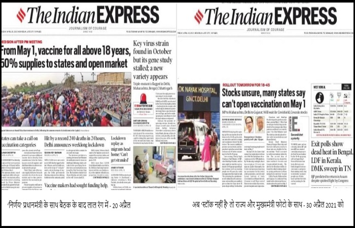 आज मतदान हो चुके हैं। रैली की खबरें छप चुकी हैं। और आज फिर लीड है कि टीके शायद नहीं लग पाएंगे। राज्य सरकारें फैसला नहीं कर पा रही हैं। बिना कहे यह कहने की कोशिश की जा रही है कि राज्य सरकारें भी भाजपा की होती तो ….। पर अभी वह मुद्दा नहीं है। मुद्दा हेडलाइन मैनेजमेंट है और वह हर हाल में जारी है। इंडियन एक्सप्रेस का 20 अप्रैल का पहला पन्ना देखिए। इसमें एक प्रचारात्मक खबर को इतना महत्व दिया गया है और यह खबर 10 दिन बाद ही व्यर्थ साबित हो गई। मुख्य शीर्षक से ऊपर लाल रंग में लिखा (फ्लैग शीर्षक) है, प्रधानमंत्री की बैठक के बाद निर्णय। और निर्णय यही था कि इस मामले में राज्य निर्णय ले सकते हैं। राज्यों के लिए टीके की कीमत, धन की उपलब्धता के साथ टीके के स्टॉक का पता नहीं था लेकिन फैसला सुना दिया गया था।