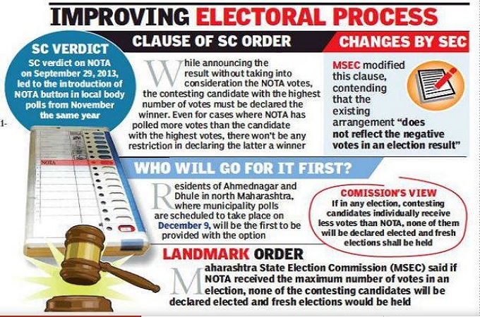 खबर आगे कहती है, “राज्य चुनाव आयुक्त जेएस सहरिया ने कहा कि वे नोटा की सहायता से चुनाव प्रक्रिया को बेहतर करने की उम्मीद कर रहे हैं और ऐसा मतदाताओं की बढ़ी हुई भागीदारी से होगा। नोटा राजनीतिक दलों को अच्छे उम्मीदवार उतारने के लिए मजबूर करेगा। …. हमलोगों ने तय किया कि इसे बदला जाए और नोटा को ज्यादा प्रभावी बनाया जाए। चुनाव अधिकारियों ने कहा कि संशोधित नोटा नियम अलगे साल के लोक सभा और राज्य विधानसभा चुनावों के लिए भी प्रभावी हो सकते हैं बशर्ते भारतीय चुनाव आयोग इस तरह का संशोधन करे। अभी तक की स्थिति के अनुसार नोटा नियम स्थानीय चुनावों के लिए लागू हैं क्योंकि हमलोगों ने धारा 243 के तहत अपने अधिकारों का उपयोग करते हुए परिवर्तन कर दिए हैं। चुनाव आयोग धारा 324 के तहत ऐसे बदलाव कर सकता है।”