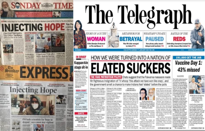जो भी हो, हेडलाइन मैनेजमेंट का आलम यह है कि आज इंडियन एक्सप्रेस और टाइम्स ऑफ इंडिया में यह खबर छह कॉलम में लीड है और शीर्षक एक ही है, ‘इंजेक्टिंग होप’ यानी उम्मीद की सुई लगाना। द टेलीग्राफ में यह खबर लीड नहीं है (अखबार ने अर्नब गोस्वामी के लीक चैट पर पुलवमा की खबर को लीड बनाया है)। टीकाकरण से संबंधित पहले पन्ने की दो कॉलम की खबर का शीर्षक है, “पहले दिन टीका लगाए जाने वाले लोगों की संख्या 43 प्रतिशत कम रही।” द हिन्दू में भी यह खबर छह कॉलम में लीड ही है। शीर्षक है, “प्रधानमंत्री ने कहा, टीके सुरक्षित हैं, अफवाहों पर ध्यान न दें।” हिन्दुस्तान टाइम्स ने और सब से आगे निकलकर इसे बैनर बनाया है। शीर्षक भी अगले चरण वाला है, टीका लग गया, सुरक्षित। कहने की जरूरत नहीं है कि कोई 135 करोड़ की आबादी में अभी एक लाख 91 हजार लोगों को ही टीका लगा है और यह कल के लक्ष्य से 43 प्रतिशत कम है, जैसा द टेलीग्राफ ने बताया है।