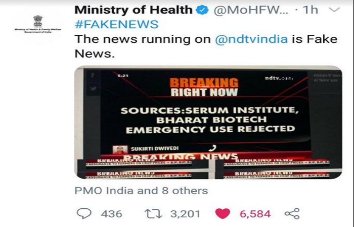 कहने की जरूरत नहीं है कि पूरा मामला प्रचार का है और लाइसेंस नहीं होने की खबर गलत नहीं थी (कम से कम उस दिन) पर उसे फेक न्यूज बता दिया गया जबकि खंडन यह होता कि ये रहा लाइसेंस या फलां तारीख को लाइसेंस जारी हुआ है। ट्वीटर पर लोगों ने न्यूज18 डॉट कॉम का स्क्रीन शॉट लगाकर पूछा कि इस बारे में क्या कहना है? यह खबर ज्यादा स्पष्ट थी, “सीरम इंस्टीट्यूट ऑफ इंडिया और भारत बायोटेक को उनके कोविड 19 वैक्सीन के लिए इमरजेंसी यूज ऑथराइजेशन देने से मना कर दिया गया है”। स्वास्थ्य मंत्रालय द्वारा इस चैनल का नाम नहीं लेने पर भी टिप्पणी थी। और यह तो पूछा ही गया कि खबर को फर्जी बताने की बजाय यह क्यों नहीं कहा जा रहा है कि दोनों कंपनियों के वैक्सीन अधिकृत या स्वीकृत घोषित हुए अथवा नहीं? असली रिपोर्टिंग होती कि स्वास्थ्य मंत्रालय से पूछा जाता पर एनडीटीवी भी क्या-क्या करे?