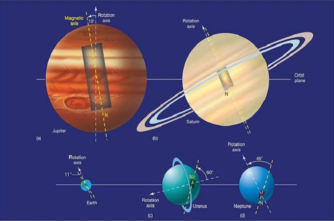 “दो ऐसे ग्रह भी हैं हमसे दूर जहाँ चुम्बकीय अक्ष और घूर्णन अक्ष में कोण बहुत ज़्यादा है। यूरेनस में 59 के आसपास और नेप्ट्यून में 47 के आसपास। न जाने कैसे जहाँ होंगे वे। न जाने वहाँ चुम्बक कैसे रहस्य बनाता होगा।”