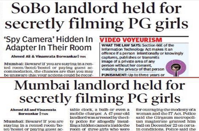 अगर आप मुंबई में या कहीं भी पेइंग गेस्ट के रूप में रहती हैं या आपकी बेटी रहती है तो सावधान हो जाइए। हो सकता है कि आपके कमरे में छुपा हुआ कैमरा लगा हो जो आपके क्रियाकलापों को रिकॉर्ड कर रहा हो। ऐसे कैमरे इलेक्ट्रिक प्लग, फैन रेग्युलेटर, मेज घड़ी, बल्ब और यहां तक कि मोबाइल चार्जर में भी छुपाकर लगाए जा सकते हैं। दक्षिणी मुंबई में ऐसा ही मामला सामने आया है जहां 47 साल का एक व्यक्ति जो अविवाहित है और अपने बुजुर्ग माता-पिता के साथ रहता है। अपने उसी घर में पेइंग गेस्ट के रूप में रहने वाली तीन लड़कियों की गतिविधियां खुफिया कैमरे में रिकार्ड करता था। पुलिस ने उसे गिरफ्तार कर लिया है लेकिन अपराध जमानती है। और उसे 22 दिसंबर को जमानत मिल गई।