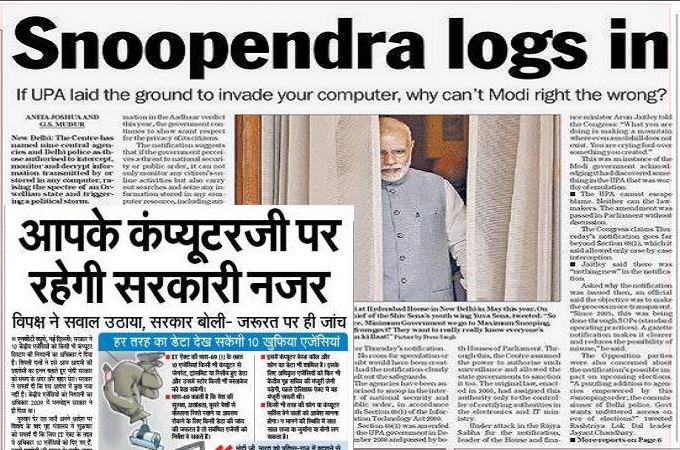 कोलकाता के अंग्रेजी दैनिक द टेलीग्राफ ने अपने अलग अंदाज में इस खबर को छह कॉलम में लीड बनाया है। साथ में प्रधानमंत्री की फोटो है जिसमें वे पर्दे के पीछे आधे दिख रहे हैं। कैप्शन है : “प्रधानमंत्री नरेन्द्र मोदी इस साल मई में नई दिल्ली स्थित हैदराबाद हाउस में। शुक्रवार को शिव सेना की युवा शाखा, युवा सेना के प्रमुख आदित्य ठाकरे ने ट्वीट किया, तो अब मैक्सिमम गरवनेंस, मिनिमम गवरन्मेंट से हम मैक्सिमम स्नूपिंग, मिनिमम सेंस ऑफ प्राइवेसी फ्रॉम गवरनमेंट की ओर जा रहे हैं”। आपको याद होगा कुर्सी पाने के लिए फेंके गए जुमलों में एक जुमला मैक्सिमम गवरनेंस, मिनिमम गवरन्मेंट (मोटे तौर पर अधिकतम काम, न्यूनतम सरकार) का भी था। राज ठाकरे का यह ट्वीट उसी पर तंज है कि अब अधिकतम जासूसी हो रही है और सरकार की ओर से निजता की समझ न्यूनतम रह गई है। अखबार ने अपनी खबर का मुख्य शीर्षक लगाया है, “स्नूपेन्द्र लॉग्स इन”। उपशीर्षक है, “अगर यूपीए ने आपके कंप्यूटर में घुसपैठ करने का आधार बनाया तो मोदी गलत को ठीक क्यों नहीं कर सकते?” हिन्दी में किसी अखबार से ऐसी उम्मीद तो नहीं कर सकते हैं लेकिन आइए देखें हाल क्या है।