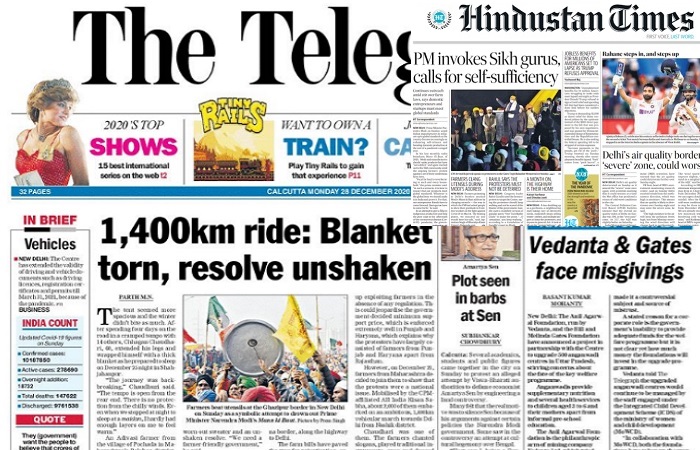 मेरा पांचवां अखबार टेलीग्राफ है। यहां भी पहले पन्ने पर आधे से ज्यादा विज्ञापन है। पर लीड किसान आंदोलन से संबंधित है। साथ में कोई सिंगल कॉलम की खबर नहीं है बल्कि दो कॉलम में मन की बात के खिलाफ बर्तन बजाने वाली वैसी ही फोटो है जैसी इंडियन एक्सप्रेस में है। हालांकि, खबर का मुख्य शीर्षक है, “1400 किलोमीटर की यात्रा : कंबल फट गया लेकिन जज्बा कायम है”। यह खबर अखबार के संवाददाता की नहीं, एक ऐसे पत्रकार की है जो किसानों के साथ यात्रा कर रहा था।