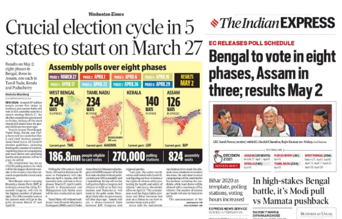 बंगाल, तमिलनाडु, केरल, असम में मतदान 27 मार्च – 29 अप्रैल, परिणाम 2 मई को – मुख्य शीर्षक।