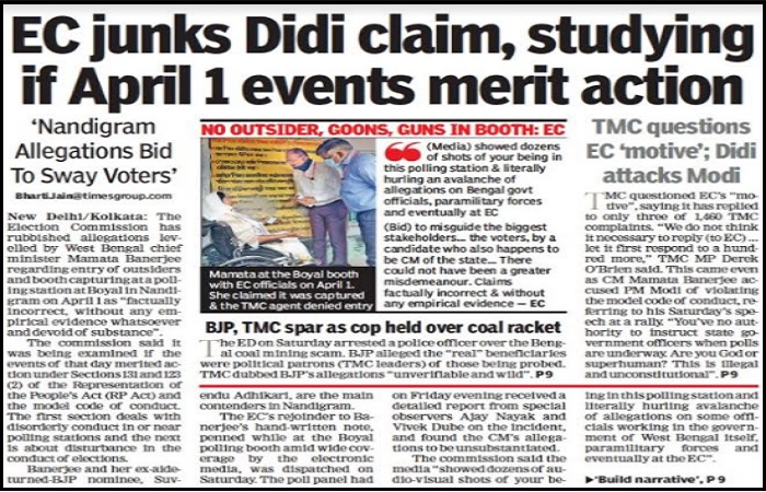 - चुनाव आयोग ने दीदी के दावे को खारिज किया, देख रहा है कि एक अप्रैल की घटनाएं कार्रवाई योग्य हैं या नहीं (टाइम्स ऑफ इंडिया)।