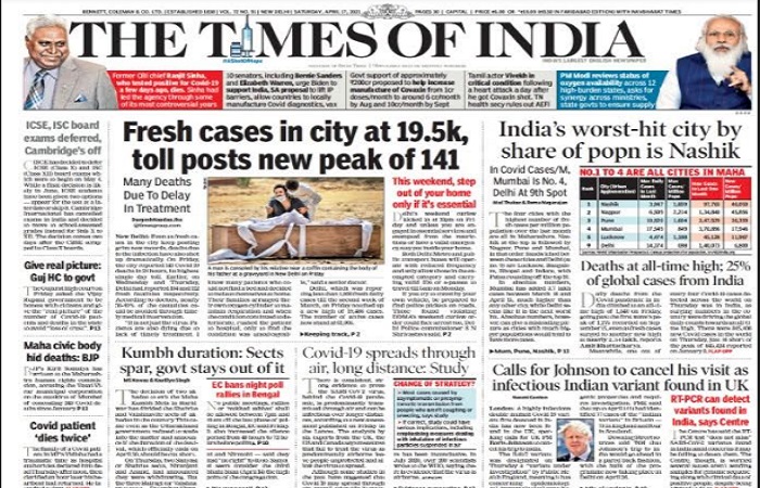 “काले शुक्रवार को मौतें बढ़ने से 57% भारत पाबंदियों में” – मुख्य शीर्षक है। पाबंदियों और सख्तियों के बावजूद देश भर में रिकार्ड मामले सामने आए। इस खबर के साथ लगे चित्र और आंकड़ों के विवरण का शीर्षक है, “देश भर में कर्फ्यू फैले।” मौतों और नए मामलों की संख्या इसके बाद दी गई है। कहने की जरूरत नहीं है कि 1340 मौतें और 2,40,000 मौतें सबसे ज्यादा होने के बावजूद लीड नहीं है। हालांकि, हिन्दुस्तान ने तो इतना भी लिखा है। टाइम्स ऑफ इंडिया ने इन बातों को अंदर के पन्ने पर डाल दिया है।
