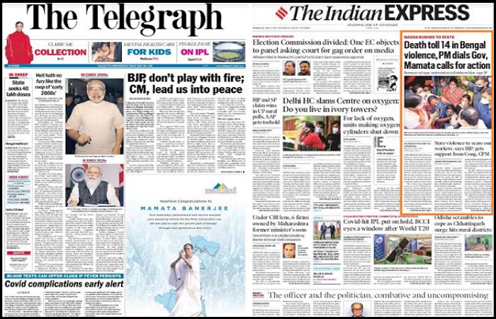 हिन्दुस्तान टाइम्स में इस खबर का शीर्षक है, “प्रधानमंत्री ने राज्यपाल को फोन किया, बंगाल की हिंसा पर भाजपा सुप्रीम कोर्ट गई।” इसके ठीक नीचे की खबर का शीर्षक है, “उत्तर प्रदेश पंचायत चुनाव के प्रमुख क्षेत्रों में भाजपा को झटका, सपा को फायदा।”आप समझ सकते हैं कि ऊपर वाली खबर नहीं होती तो नीचे वाली खबर ऊपर होती और ज्यादा पढ़ी जाती है। संभव है, “ऊपर वाली खबर हेडलाइन मैनेजमेंट का हिस्सा हो पर इसकी सच्चाई दो चार दिन में स्पष्ट होगी।” टाइम्स ऑफ इंडिया में भी दोनों खबरें लगभग एक जैसी हैं और वैसे ही ऊपर नीचे। द हिन्दू में भी यह खबर है, चुनाव के बाद की हिंसा पर प्रधानमंत्री ने गवरनर को फोन किया।