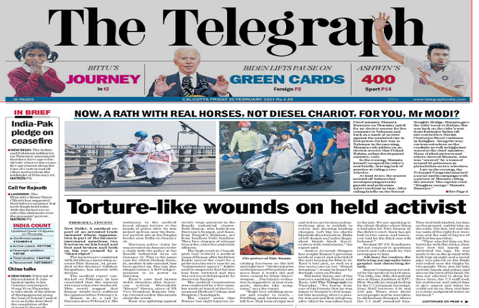 द टेलीग्राफ में अक्सर ऐसी खबर होती है। आज की खबर का शीर्षक है, “गिरफ्तार ऐक्टिविस्ट को यातना जैसे जख्म”। अखबार ने बताया है कि मजदूर अधिकार संगठन के प्रेसिडेंट, 24 साल के शिव कुमार की मेडिकल रिपोर्ट उनके डरावने विवरण से मेल खाती है। उनके हाथ और पैर में दो जगह फ्रैक्चर है और अंगूठे में चोट के निशान है। अखबार ने लिखा है कि शिव कुमार का संगठन किसान आंदोलन के साथ है। वे 2 फरवरी से जेल में हैं और मेडिकल रिपोर्ट के अनुसार ये जख्म 6 फरवरी से पहले के हैं। उन्हें दिल्ली सीमा पर सिंघु से 16 जनवरी को गिरफ्तार किया गया था। हरियाणा पुलिस का दावा कुछ और है। अखबार ने लिखा है कि इसी मामले में एक और ट्रेड यूनियनिस्ट नोदीप कौर को गिरफ्तार किया गया था। उसने भी यातना देने के आरोप लगाए हैं।