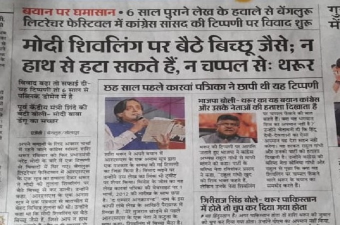 मैंने जो अखबार देखे उनमें सिर्फ दैनिक भास्कर ने इसे विस्तार से छापा है। शीर्षक है, “मोदी शिवलिंग पर बैठे बिच्छू जैसे; न हाथ से हटा सकते हैं, न चप्पल से मार सकते हैं : थरूर”… इस तथ्य के साथ कि भाजपा नेता छह साल पुरानी उपमा से भी परेशान हैं। उसपर रवि शंकार प्रसाद का हमेशा निकलने वाला गुस्सा फोटो के साथ बॉक्स में है। जो तुलना थरूर की बताई जा रही है वह असल में थरूर ने आरएसएस के किसी अनाम सूत्र के हवाले से कही थी और छह साल पहले ‘कारवां’ पत्रिका में छपी भी थी। दैनिक भास्कर ने इस खबर के साथ पूर्व केंद्रीय मंत्री सुशील कुमार शिन्दे की बेटी प्रणीति शिन्दे का बयान भी प्रमुखता से छापा है। बोलीं – मोदी बाबा डेंगू का मच्छर। प्रणीति सोलापुर से कांग्रेस विधायक हैं। बिच्छू पर केंद्रीय मंत्री गिरिराज सिंह बोले, “थरूर पाकिस्तान में होते तो चुप कर दिया गया होता” को भी बॉक्स में छापा है।