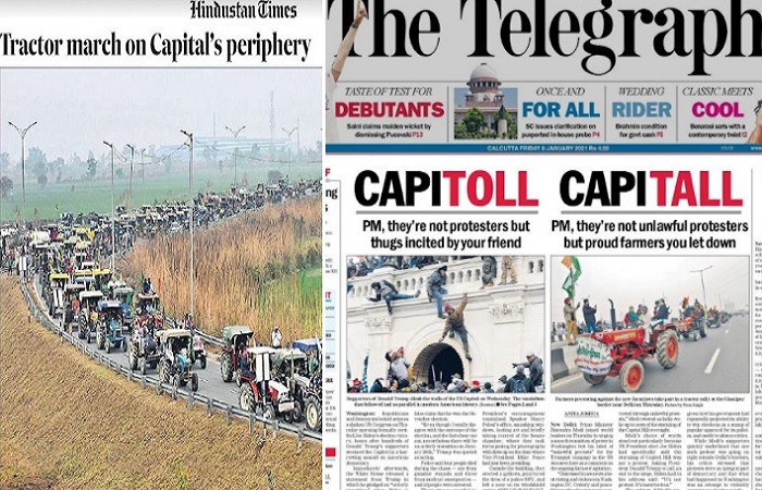 इनके जरिए, प्रधानमंत्री को बताया गया है कि अमेरिका में उत्पात मचाने वाले प्रदर्शनकारी नहीं आपके मित्र द्वारा उकसाए गए अंग्रेजी वाले ठग यानी गुण्डे थे। दूसरा शीर्षक किसानों के लिए है, प्रधानमंत्री जी, वे गैर कानूनी प्रदर्शनकारी नहीं बल्कि गौरवशाली किसान हैं जिन्हें आपने निराश किया है। कहने की जरूरत नहीं है कि प्रधानमंत्री की तथाकथित प्रतिक्रिया कहीं पे निगाहें, कहीं पे निशाना वाली थी और द टेलीग्राफ ने उन्हें और उनके जरिए अपने पाठकों को बता है कि मामला वैसा है नहीं जैसा वे बनाना चाहते हैं।