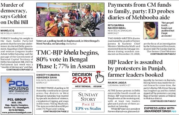 इंडियन एक्सप्रेस ने आज ‘मतदान शुरू’ या ‘पहले चरण का मतदान हुआ’ को खेला शुरू लिखा गया है। असली ‘खेल’ की खबर द टेलीग्राफ और दूसरे अखबारों में है। अगर आज द टेलीग्राफ वाली खबर नहीं होती या इंडियन एक्सप्रेस में भी छपी होती तो स्थिति सामान्य रहती और उसे खेला नहीं कहा जाता। इंडियन एक्सप्रेस में पहले पन्ने पर यह खबर नहीं है। दूसरे अखबारों में भी नहीं होगी और यही खेल आजकल मीडिया में चल रहा है। जिसे गोदी मीडिया कहा जाता है। अंग्रेजी माध्यम वाले बच्चे इसे मोदी-गोदी भर समझते हैं पर यह मामला उससे बहुत गहरा है। आज इंडियन एक्सप्रेस और टाइम्स ऑफ इंडिया को छोड़कर बाकी तीनों अखबारों में पश्चिम बंगाल, असम में कल हुए मतदान की खबर लीड है। बाकी दोनों अखबारों में भी यह खबर पहले पन्ने पर प्रमुखता से है। इसलिए आज इस खबर और प्रस्तुति की चर्चा। वह इसलिए भी कि देश में चार महीने से भी ज्यादा समय से किसानों का आंदोलन चल रहा है।