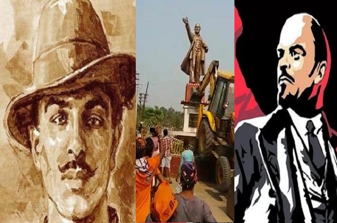 बीजेपी कार्यकर्ताओं ने जीत के जश्न में त्रिपुरा में रूसी क्रांति के नायक लेनिन की मूर्ति ढहा दी। कुछ लोग सोशल मीडिया में तर्क दे रहे हैं कि कम्युनिस्टों ने भगत सिंह जैसे क्रांतिकारी की मूर्ति न लगाकर ‘विदेशी’ लेनिन की मूर्ति लगाकर ग़लत किया था। मूर्तियाँ आदर्शों पर चलने की कितनी प्रेरणा देती हैं, यह अलग बहस है, लेकिन भगत सिंह को लेनिन के बरक्स खड़ा करना एक हास्यास्पद कोशिश है। सच यह है कि लेनिन ने दुनिया भर के क्रांतिकारियों को प्रेरित किया था और भगत सिंह तो उनके दीवाने ही थे।