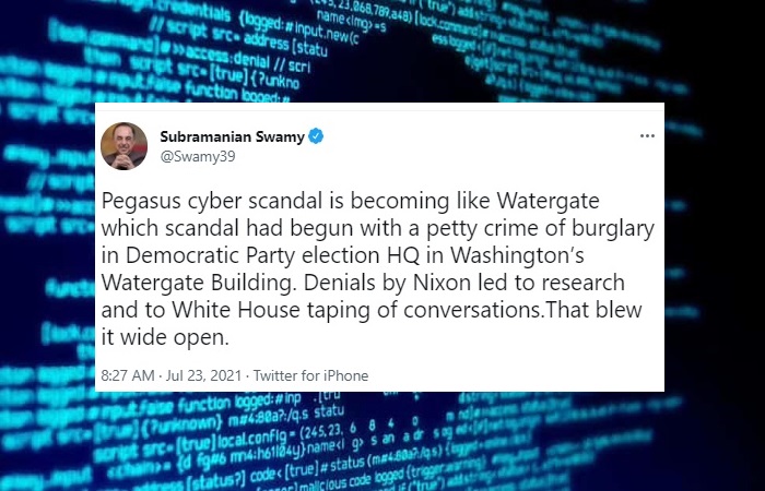 इधर नेशनल सिक्युरिटी काउंसिल के बजट में अप्रत्याशित बढोतरी पर भी सवाल उठने लगे हैं। यह सवाल भाजपा सांसद डॉ सुब्रमण्यम स्वामी ने उठाया है। डॉ स्वामी से ट्वीट किया है कि, उन्होंने राज्य सभा के पुस्तकालय से नेशनल सिक्युरिटी काउंसिल ( NSS ) के बजट के विवरण के बारे में पूछा तो पता चला कि, वर्ष 2015 – 16 में ₹ 44 करोड़ और वर्ष 2016 – 17 में ₹ 33 करोड़ था। यही बजट अप्रत्याशित रूप से बढ़ कर, 2017 – 18 में, ₹ 333 करोड़ का हो गया। यह बजट बढोतरी क्यों हुयी। अमूमन हर साल का बजट अपने पिछले साल के बजट की तुलना में कुछ न कुछ बढ़ता ही रहता है, इसका काऱण मुद्रास्फीति, बाजार की महंगाई का असर आदि होता है। कभी कभी जब कोई नई योजनाएं आती हैं तब भी बजट में उल्लेखनीय वृद्धि हो जाती है। यहीं, यह सवाल स्वाभाविक रूप से उपजता है कि , ₹ 33 करोड़ की तुलना में ₹ 333 करोड़ की, की गयी अचानक वृद्धि किन खर्चो को पूरा करने के लिये की गई थी। स्वामी, एक आशंका यह भी जताते हैं कि कहीं बजट की यह अप्रत्याशित बढोत्तरी पेगासस स्पाइवेयर के लिये आवश्यक संसाधन जुटाने, उसके लिये रिसर्च और डेवलपमेंट जैसे मूलभूत इंफ्रास्ट्रक्चर बनाने के लिये तो नही किया गया था। हालांकि सरकार इस मामले पर मौन है और पेगासस स्पाइवेयर खरीदे जाने या न खरीदे जाने के बारे में सरकार का अभी तक कोई अधिकृत वक्तव्य नहीं आया है।