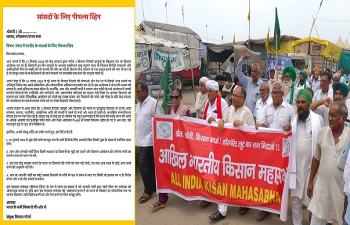 संयुक्त किसान मोर्चा ने सांसदों के लिए पीपुल्स व्हिप जारी करते हुए कहा है कि वे मानसून सत्र में कृषि क़ानून रद्द करने की किसानों की माँग को पूरी ताक़त से उठायें और किसी भी स्थिति में वॉक आउट न करें। वे लोकसभा और राज्यसभा में सरकार की कॉरपोरेटरस्त और किसान विरोधी नीतियों का खुलासा करें।