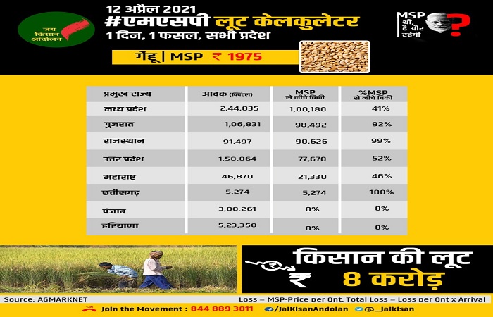 जय किसान आंदोलन ने अपने MSP लूट कैलकुलेटर से आज गेहूँ किसानों के साथ हुई लूट का जायज़ा लिया। संगठन के मुताबिक सिर्फ एक दिन, 12 अप्रैल को गेहूँ किसानों के साथ 8 करोड़ की लूट हुई।