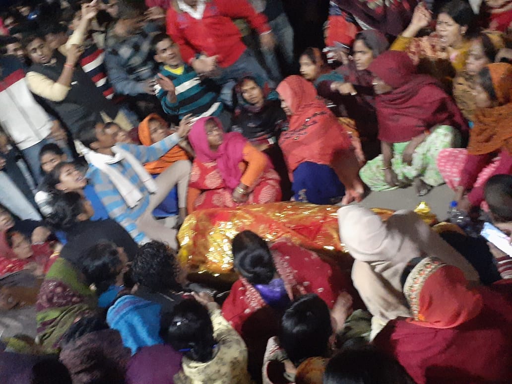 तेलियाबाग में मरी माई चौराहे पर लाश के साथ सैकड़ों लोग सड़क पर उतर गए और सरकार के खिलाफ प्रदर्शन शुरू कर दिया.