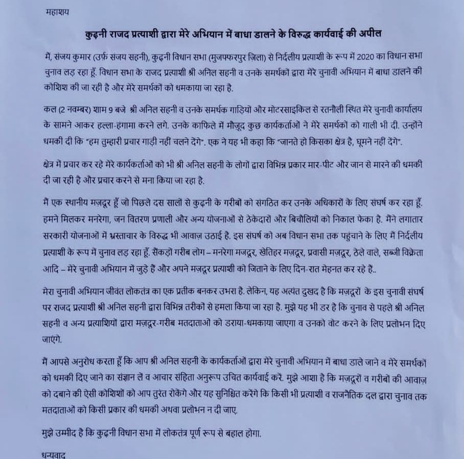 दूसरी घटना के रूप में मुजफ्फरपुर के कुढ़नी विधानसभा से निर्दलीय प्रत्याशी संजय सहनी से जुडी है. संजय सहनी अपने क्षेत्र के जाने-माने मनरेगा कार्यकर्त्ता सह सामाजिक कार्यकर्त्ता हैं. वे मनरेगा सहित वितरण प्रणाली आदि योजनाओं पर लगातार संघर्ष करते रहे हैं. इस विधानसभा चुनाव में वे निर्दलीय प्रत्याशी के रूप में चुनावी मैदान में हैं. जिसके कारण उन्हें अलग-अलग तरह से डराने-धमकाने की कोशिश की जा रही है. उन्होंने चुनाव आयोग से अपने सह-प्रत्याशी अनिल सहनी (राजद) एवं उनके कार्यकर्ता के खिलाफ़ शिकायत भी की हैं. लेकिन आयोग के तरफ से कोई सकारात्मक पहल नहीं हुई है.