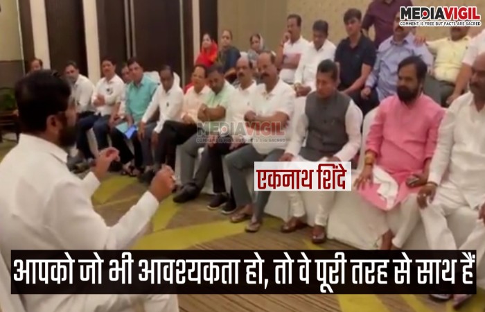 ये वीडियो, गुवाहाटी से समाचार चैनल्स के पास गुरूवार को पहुंचा और इसमें एकनाथ शिंदे, बाग़ी विधायकों से बात करते दिख रहे हैं। इस वीडियो को लगातार, तमाम समाचार चैनल सिर्फ विधायकों की तस्वीर और उनकी गुवाहाटी में मौजूदगी दिखाने के लिए चला रहे हैं। लेकिन शायद उनका ध्यान इसके ऑडियो पर नहीं गया या फिर उन्होंने जानबूझ कर इस वीडियो में एकनाथ शिंदे की आवाज़ पर ध्यान नहीं दिया। हम बताते हैं कि इस वीडियो में एकनाथ शिंदे क्या कह रहे हैं..