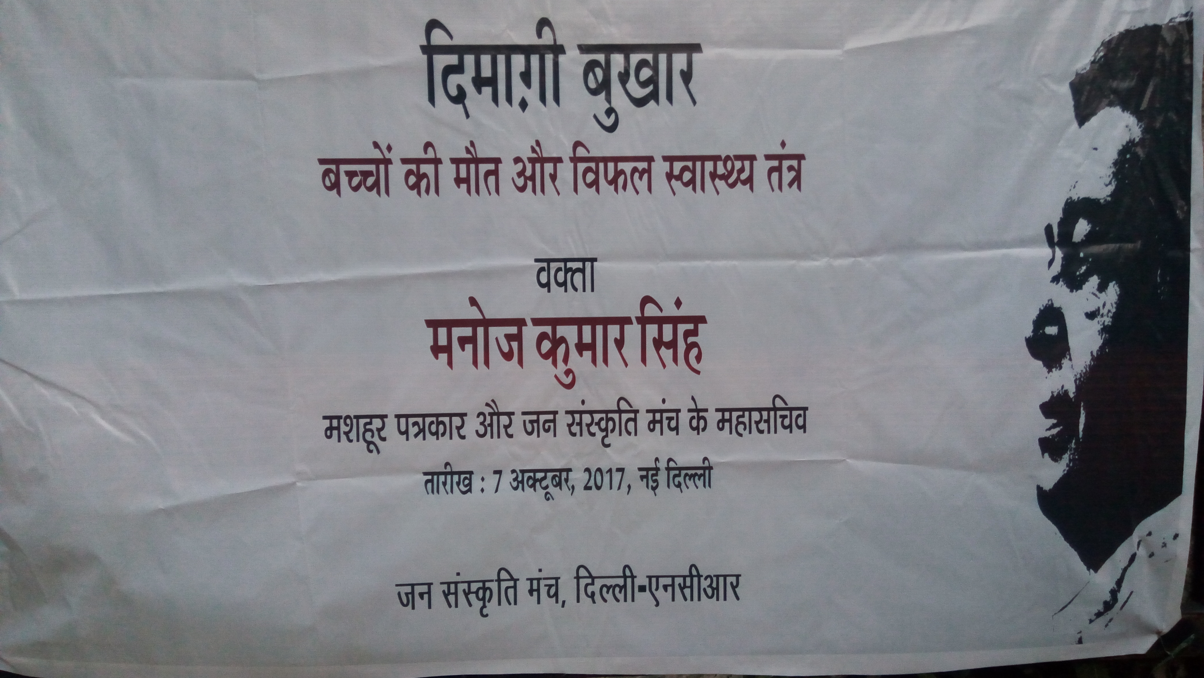 मनोज कुमार सिंह लंबे समय से इंसेफेलायटिस की बीमारी को कवर करते रहे हैं। गांव-गांव घूम कर उन्होंने इस बीमारी के बारे में सूचनाएं जुटायी हैं और अकादमिक शोधों के माध्यम से इस विषय को पाठकों के बीच रखने की कोशिश की है। इसी विषय पर उन्होंने दिल्ली के राजेंद्र भवन में शनिवार, 7 अक्टूबर 2017 की शाम घंटे भर से भी लंबा और बेहद सूचनाप्रद व्याख्यान दिया।